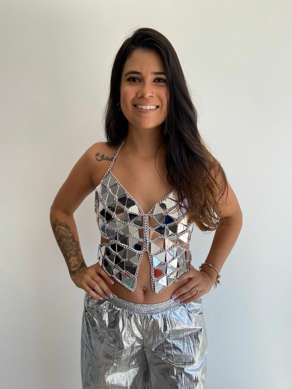 Body Chain Borboleta Espelhado todo feito à mão, com correntes em alumínio inoxidável (não enferruja nem escurece) e pedrarias em acrílico espelhado.