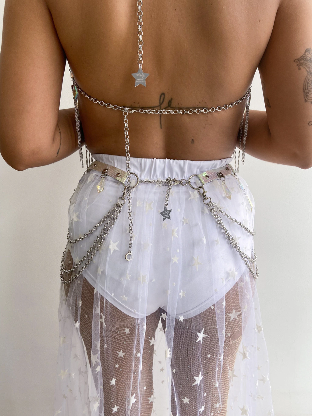 Cinto Vibration, todo feito à mão com lonita rosa, argolas, correntes e pedrinhas furta-cor.