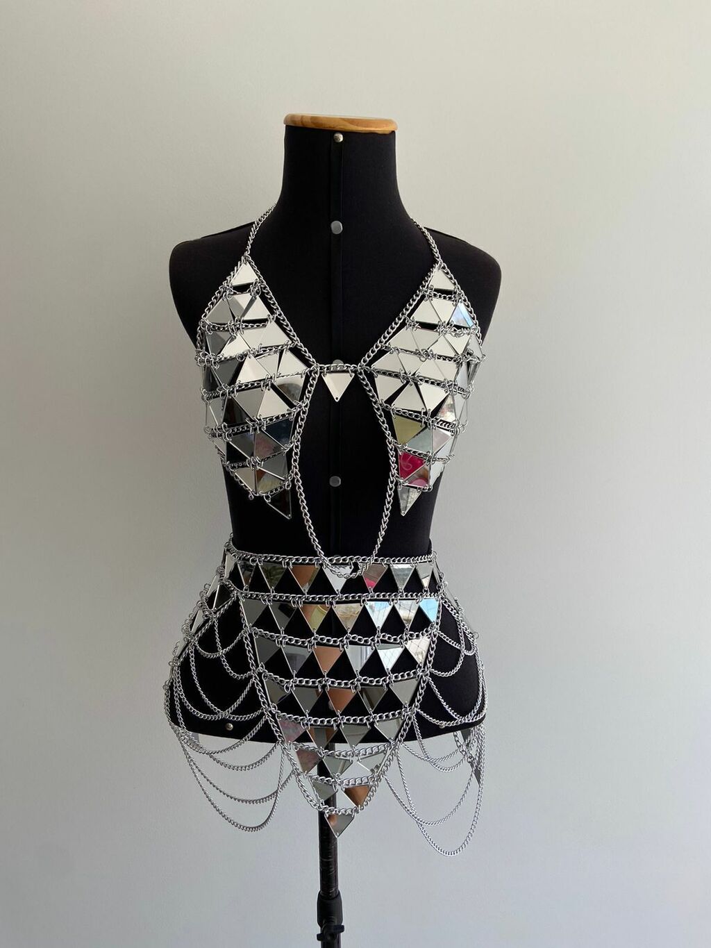 Conjunto Reflexo todo feito à mão com correntes e argolas de alumínio inoxidável (não enferruja nem escurece), e pedraria em acrílico espelhado.