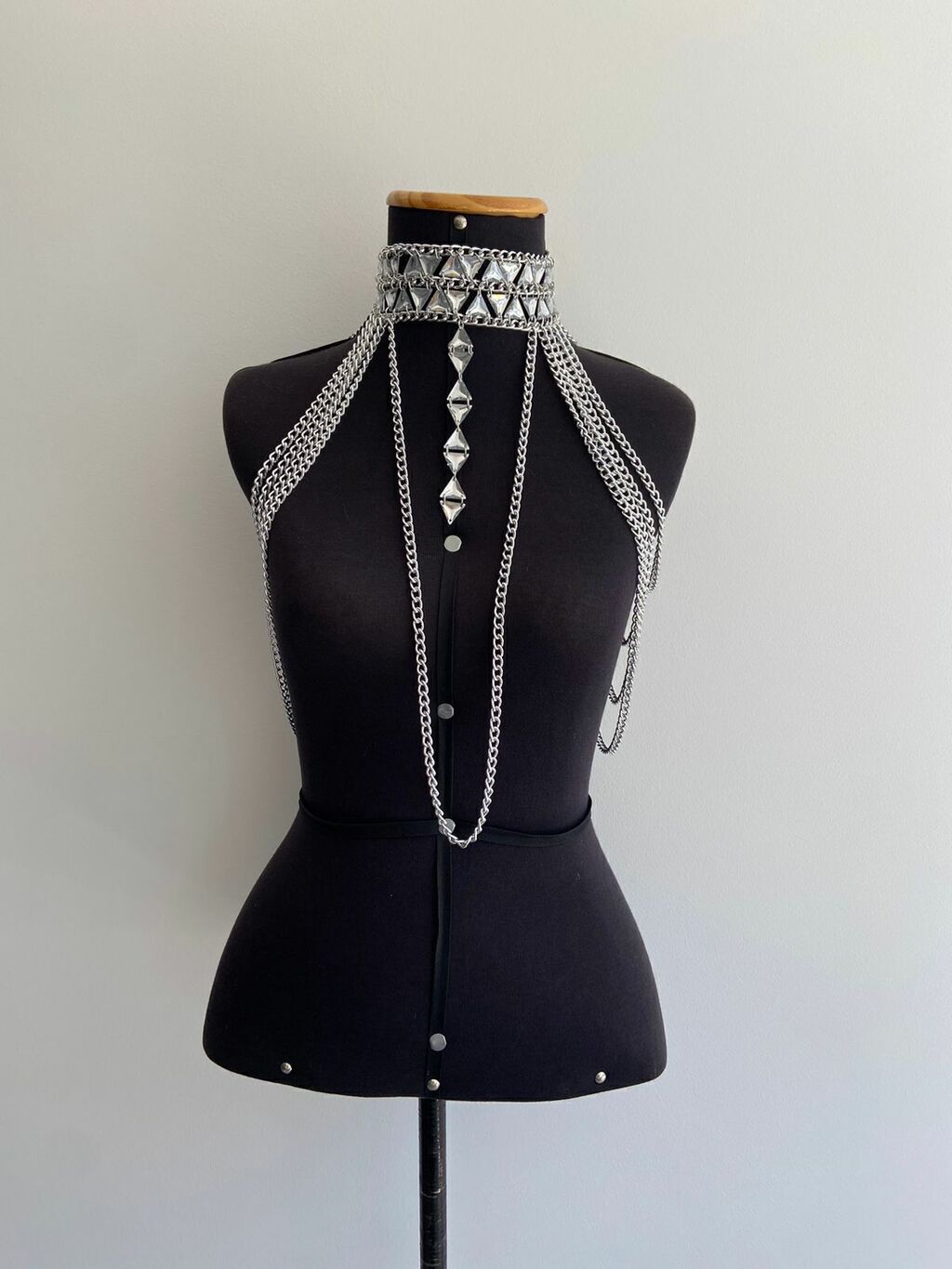 Ombreira Circulou feito à mão com correntes de alumínio inoxidável (não enferruja nem escurece), e pedrarias. Com correntes penduradas no ombro em tamanhos diferentes e três fechos de mosquetão.