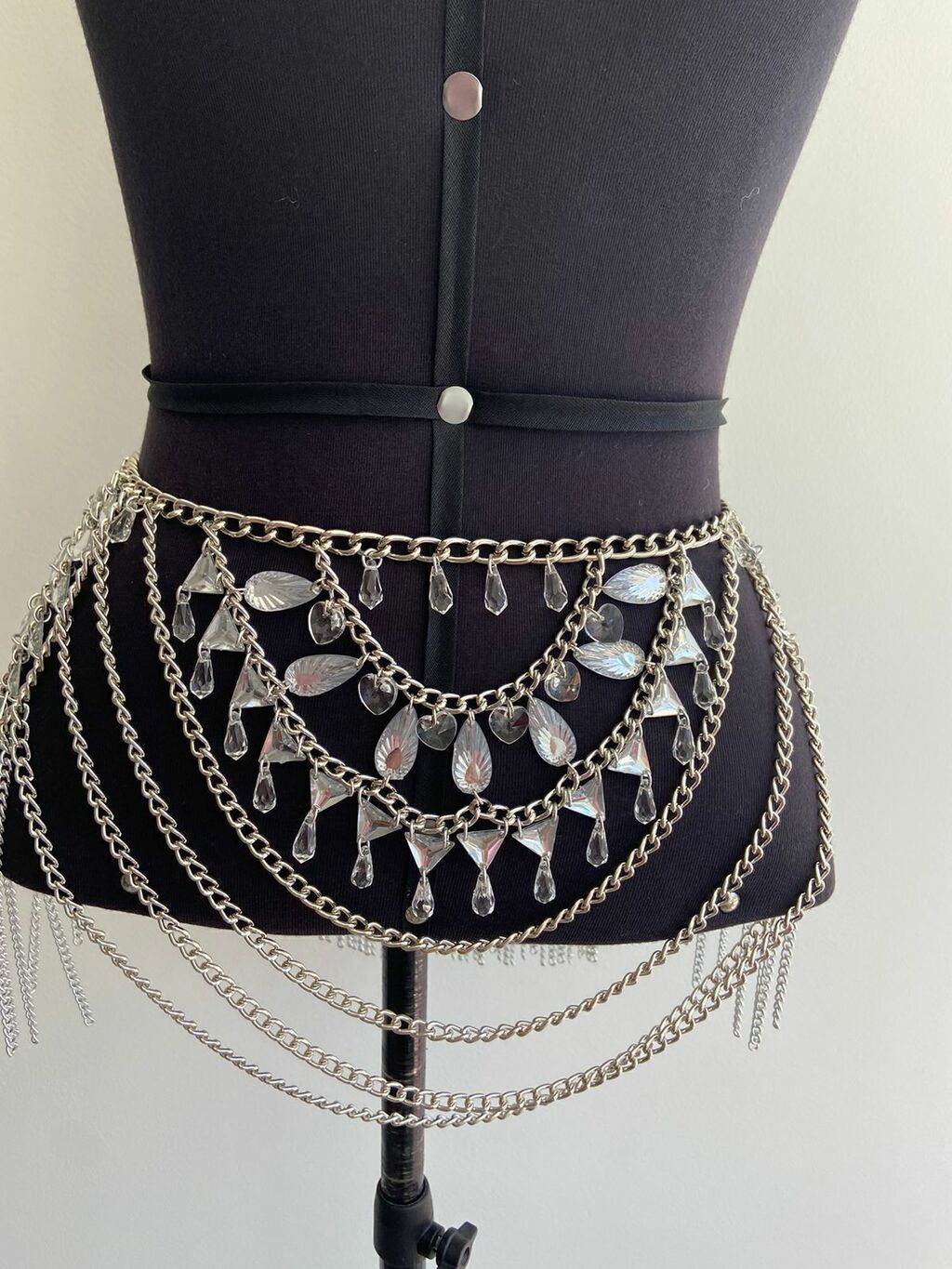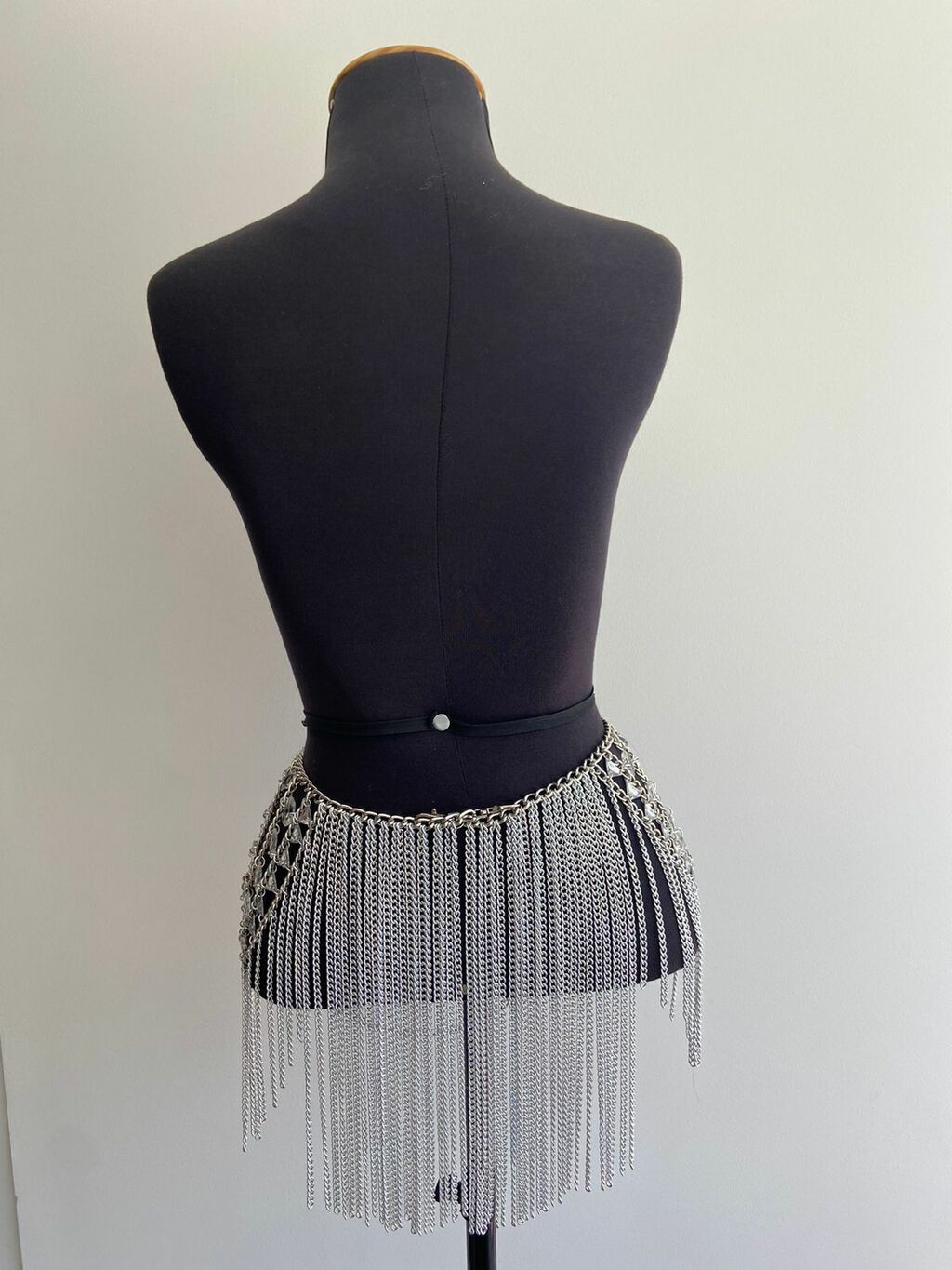 Saia Sophie toda feita à mão, com pedrarias e correntes. Disponível na cor prata.