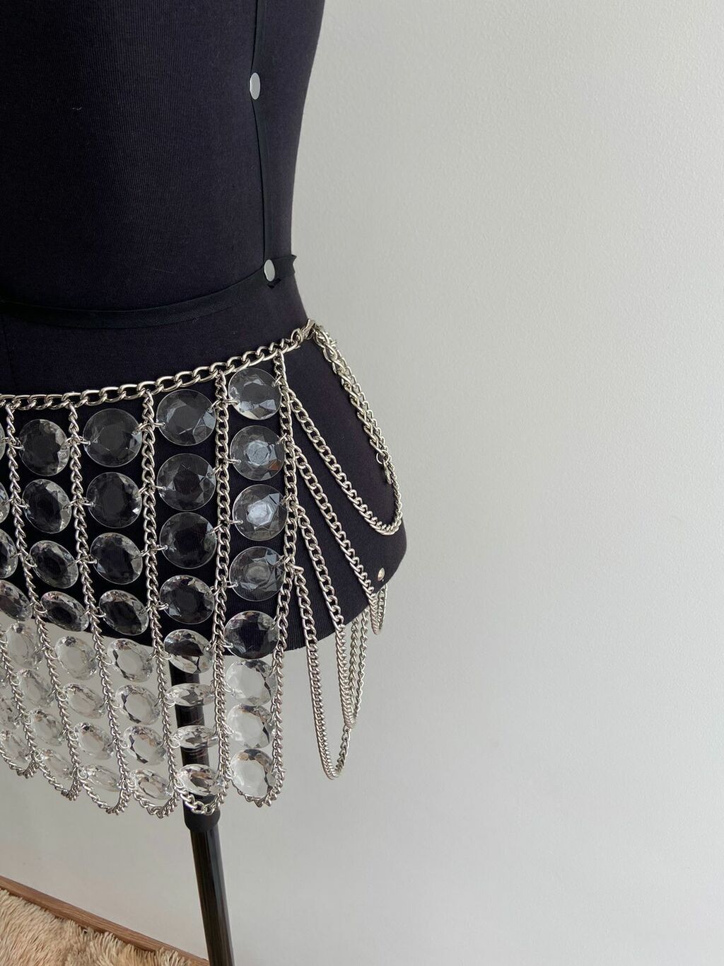 Saia Union feito à mão com correntes e argolas de alumínio inoxidável (não enferruja nem escurece), e pedraria em acrílico transparente. Com corrente pendurada nas laterais e fecho de mosquetão nas duas laterais da cintura para ajustar melhor ao seu corpo.