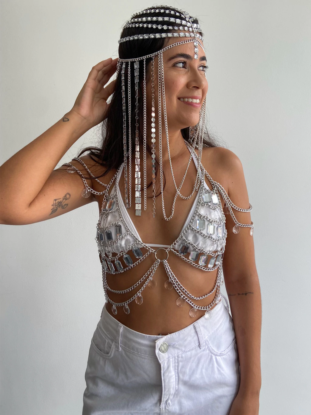 Top Cristal com Ombreira. Todo feito à mão com correntes em alumínio inoxidável (não enferruja nem escurece), pedrarias em acrílico, chaton e argola.