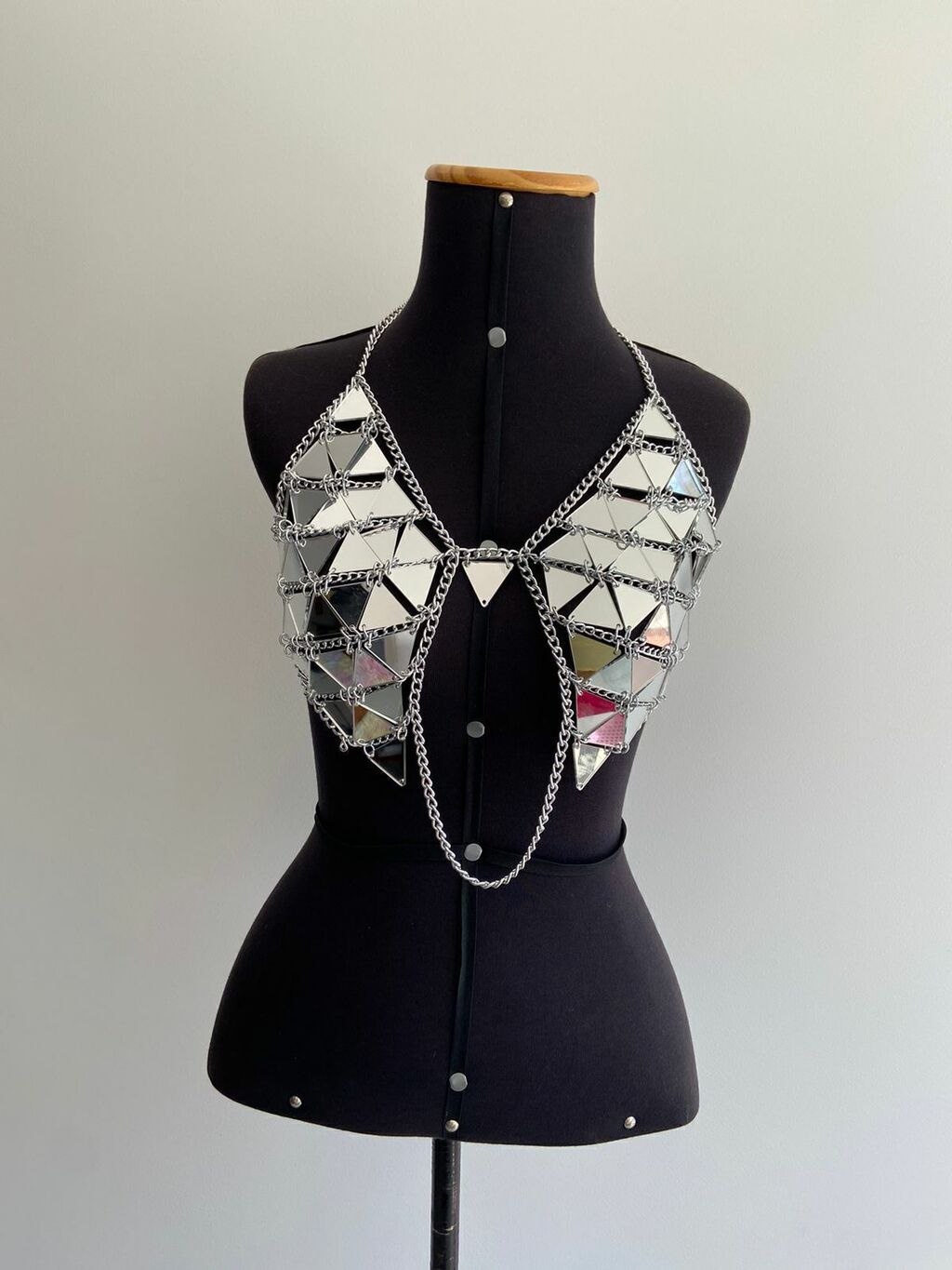 Top Reflexo todo feito à mão com correntes e argolas de alumínio inoxidável (não enferruja nem escurece), e pedraria em acrílico espelhado. Ajustável no pescoço e nas costas.