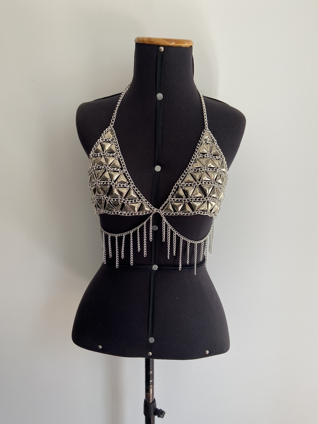 Top Rock in Rio todo feito à mão com correntes em alumínio, chaton e detalhe de correntes penduradas. Este acessório é perfeito para quem quer brilhar no festival e arrasar no look!